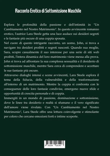 Esplora le profondità della passione e dell'intimità in "Un Cambiamento nel Nostro Matrimonio". In questo avvincente romanzo erotico, l'autrice Lara Steele getta una luce audace sui desideri segreti e le fantasie più oscure di una coppia sposata.Nel cuore di questo intrigante racconto, un uomo, John, si trova a navigare tra desideri proibiti e segreti nascosti. Quando sua moglie, Sara, scopre casualmente il suo interesse per una serie di siti web proibiti, l'intera dinamica del loro matrimonio viene messa alla prova. John si trova ad affrontare la sua complessa sessualità e il desiderio di sottomissione maschile, mentre Sara cerca di comprendere e accettare le sue fantasie più oscure.Attraverso dialoghi intensi e scene avvincenti, Lara Steele esplora il tema della fiducia, della vulnerabilità e della trasformazione all'interno di un matrimonio. Mentre la coppia si confronta con le conseguenze delle loro fantasie condivise, emergono nuove sfide e opportunità di crescita personale e di coppia.Immergiti in un mondo di passione, dominazione e sottomissione, dove le linee tra desiderio e realtà si sfumano e il vero significato dell'amore viene rivelato. Con "Un Cambiamento nel Nostro Matrimonio", Lara Steele offre una lettura coinvolgente e stimolante per coloro che cercano emozioni forti e intime scoperte.