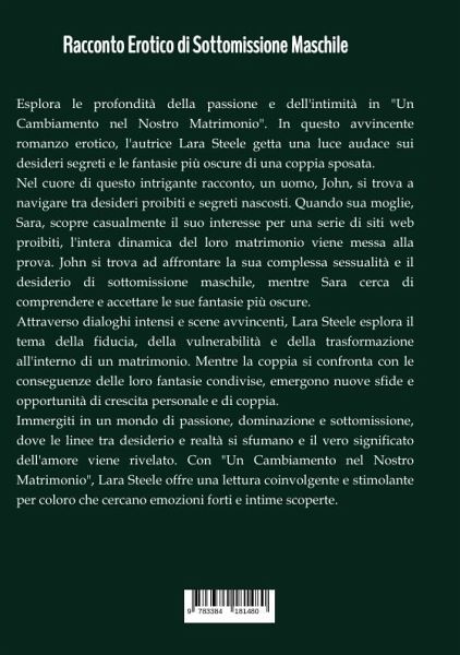 Esplora le profondità della passione e dell'intimità in "Un Cambiamento nel Nostro Matrimonio". In questo avvincente romanzo erotico, l'autrice Lara Steele getta una luce audace sui desideri segreti e le fantasie più oscure di una coppia sposata.Nel cuore di questo intrigante racconto, un uomo, John, si trova a navigare tra desideri proibiti e segreti nascosti. Quando sua moglie, Sara, scopre casualmente il suo interesse per una serie di siti web proibiti, l'intera dinamica del loro matrimonio viene messa alla prova. John si trova ad affrontare la sua complessa sessualità e il desiderio di sottomissione maschile, mentre Sara cerca di comprendere e accettare le sue fantasie più oscure.Attraverso dialoghi intensi e scene avvincenti, Lara Steele esplora il tema della fiducia, della vulnerabilità e della trasformazione all'interno di un matrimonio. Mentre la coppia si confronta con le conseguenze delle loro fantasie condivise, emergono nuove sfide e opportunità di crescita personale e di coppia.Immergiti in un mondo di passione, dominazione e sottomissione, dove le linee tra desiderio e realtà si sfumano e il vero significato dell'amore viene rivelato. Con "Un Cambiamento nel Nostro Matrimonio", Lara Steele offre una lettura coinvolgente e stimolante per coloro che cercano emozioni forti e intime scoperte.