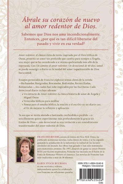 Sabemos que Dios nos ama incondicionalmente. Entonces, ¿por qué es tan difícil liberarse del pasado y vivir en esa verdad? Inspirado por el libro bíblico de Oseas, Amor redentor presenta un amor tan profundo que cambia para siempre a Ángela, una mujer que se había considerado a sí misma como dañada más allá de la esperanza. Con Un camino al amor redentor: Un devocional de 40 días, usted se puede sumergir a diario en la verdad del amor inquebrantable de Dios por usted. Los escritos personales de Francine exploran temas claves de la novela -Rechazada, Resignada, Rescatada, Redimida, Reconciliada, Restaurada- inspirados por las Escrituras. Ya sea que se sienta atascada o lastimada, confundida o perdida -o simplemente quiera experimentar más profundamente la gracia ilimitada de Dios-este devocional la invita a una comprensión transformadora del amor redentor de Dios. We know that God loves us unconditionally. So why is it so hard to break free from the past and live in that truth? Inspired by the biblical book of Hosea, Redeeming Love introduces a love so profound that it forever changes Angel, a woman who had viewed herself as broken beyond redemption.