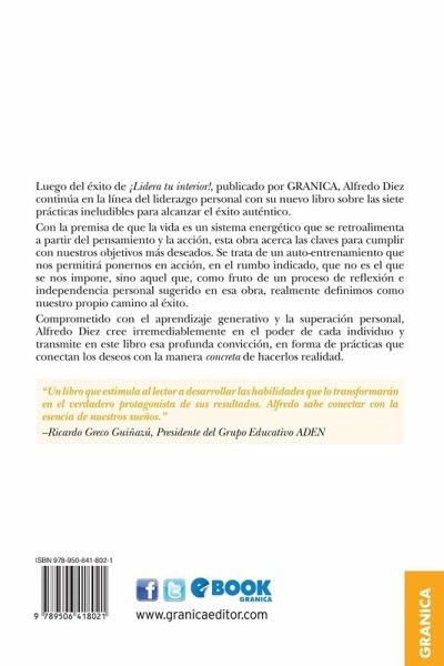 Con la premisa de que la vida es un sistema energético que se retroalimenta a partir del pensamiento y la acción, esta obra acerca las claves para cumplir con nuestros objetivos más deseados. Se trata de un auto-entrenamiento que nos permitirá poner en acción, en el rumbo indicado, que no es el que se nos impone, sino aquel que, como fruto de un proceso de reflexión e independencia personal sugerido en esa obra, realmente definimos como nuestro propio camino al éxito. 3