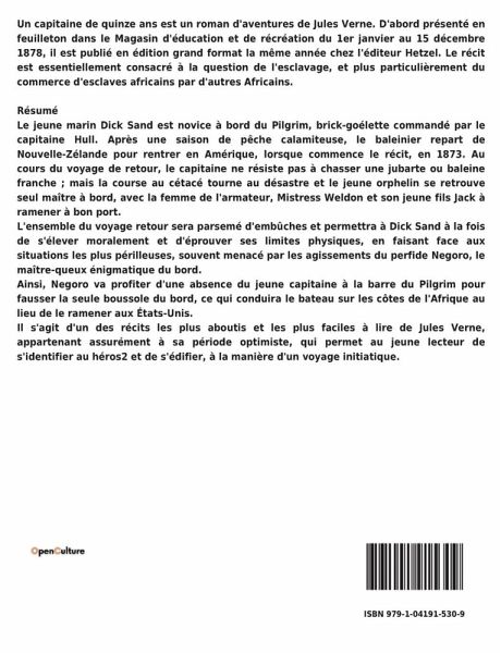 "Un capitaine de quinze ans" est un roman d'aventure écrit par Jules Verne, publié en 1878. L'histoire débute à bord du "Pilgrim", un brick-goélette commandé par le capitaine Hull, qui navigue dans l'océan Pacifique. À la suite d'un incident tragique, le jeune mousse Dick Sand, âgé de seulement quinze ans, se retrouve à la tête du navire. Avec courage et détermination, il doit mener l'équipage et les passagers à bon port. Cependant, leur voyage prend une tournure inattendue lorsqu'ils échouent sur les côtes africaines, en Angola, au lieu de l'Amérique du Sud comme prévu. La première partie du roman se concentre sur les défis maritimes auxquels Dick Sand et son équipage font face, passant de la gestion du navire aux dangers de la mer. La deuxième partie explore les périls terrestres, alors que le groupe doit traverser des territoires hostiles et faire face à la traite des esclaves, un thème central du récit. Les personnages rencontrent divers obstacles, dont la trahison de Negoro, un cuisinier malveillant, et Harris, un complice, qui les conduisent dans un piège. Le roman aborde des thèmes tels que le courage, la responsabilité, l'injustice de l'esclavage et la lutte pour la survie. À travers les aventures de Dick Sand, Jules Verne offre une critique sociale et une réflexion sur la condition humaine. Le récit est enrichi par des descriptions détaillées de la faune, de la flore et des coutumes africaines, témoignant de l'intérêt de Verne pour la géographie et l'ethnologie.