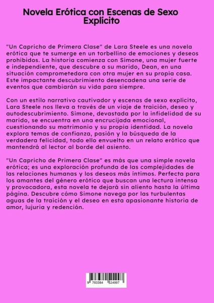 "Un Capricho de Primera Clase" de Lara Steele es una novela erótica que te sumerge en un torbellino de emociones y deseos prohibidos. La historia comienza con Simone, una mujer fuerte e independiente, que descubre a su marido, Dean, en una situación comprometedora con otra mujer en su propia casa. Este impactante descubrimiento desencadena una serie de eventos que cambiarán su vida para siempre.Con un estilo narrativo cautivador y escenas de sexo explícito, Lara Steele nos lleva a través de un viaje de traición, deseo y autodescubrimiento. Simone, devastada por la infidelidad de su marido, se encuentra en una encrucijada emocional, cuestionando su matrimonio y su propia identidad. La novela explora temas de confianza, pasión y la búsqueda de la verdadera felicidad, todo ello envuelto en un relato erótico que mantendrá al lector al borde del asiento."Un Capricho de Primera Clase" es más que una simple novela erótica; es una exploración profunda de las complejidades de las relaciones humanas y los deseos más íntimos. Perfecta para los amantes del género erótico que buscan una lectura intensa y provocadora, esta novela te dejará sin aliento hasta la última página. Descubre cómo Simone navega por las turbulentas aguas de la traición y el deseo en esta apasionante historia de amor, lujuria y redención.