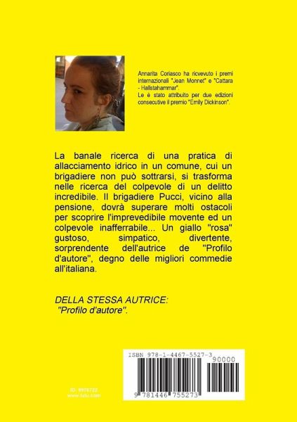 La banale ricerca di una pratica di allacciamento idrico in un comune, cui un brigadiere non può sottrarsi, si trasforma nella ricerca del colpevole di un delitto incredibile. Il brigadiere Pucci, vicino alla pensione, dovrà superare molti ostacoli per scoprire l'imprevedibile movente ed un colpevole inafferrabile... Un giallo "rosa" gustoso, simpatico, divertente, sorprendente dell'autrice de "Profilo d'autore", degno delle migliori commedie all'italiana.