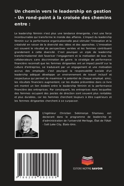 Le leadership féminin n'est plus une tendance émergente, c'est une force incontournable qui transforme le monde des affaires. L'impact du leadership féminin sur la performance organisationnelle peut stimuler l'innovation et la créativité en raison de la diversité des idées et des approches. L'innovation est souvent le résultat de perspectives variées et les femmes contribuent grandement à cette diversité. C'est pourquoi un style de leadership transformationnel doit favoriser l'engagement et la motivation de tous les collaborateurs sans discrimination de genre. la stratégie de performance financière reconnaît que les femmes dirigeantes ont un impact positif sur la culture d'entreprise, se traduisant par un engagement et une motivation accrus des employés. c'est pourquoi la responsabilité sociale d'un leadership adéquat développe un environnement de travail inclusif et respectueux qui permet de maximiser le potentiel de chaque employé. ainsi, les résultats financiers augmentent, car les études présentées dans ce livre ont montré un lien évident entre le leadership féminin et la performance financière des entreprises. Par conséquent, les entreprises dans lesquelles des femmes occupent des postes de direction sont souvent plus rentables et plus durables, car les hommes cherchent toujours à être supérieurs et les femmes dirigeantes cherchent à se surpasser.