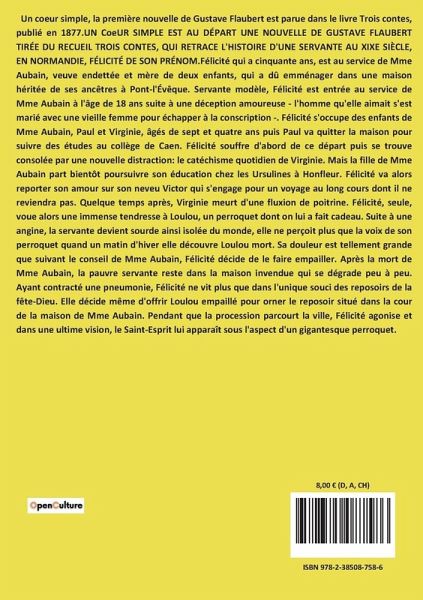 Un coeur simple, la première nouvelle de Gustave Flaubert est parue dans le livre Trois contes, publié en 1877.UN CoeUR SIMPLE EST AU DÉPART UNE NOUVELLE DE GUSTAVE FLAUBERT TIRÉE DU RECUEIL TROIS CONTES, QUI RETRACE L'HISTOIRE D'UNE SERVANTE AU XIXE SIÈCLE, EN NORMANDIE, FÉLICITÉ DE SON PRÉNOM.Félicité qui a cinquante ans, est au service de Mme Aubain, veuve endettée et mère de deux enfants, qui a dû emménager dans une maison héritée de ses ancêtres à Pont-l'Évêque. Servante modèle, Félicité est entrée au service de Mme Aubain à l'âge de 18 ans suite à une déception amoureuse - l'homme qu'elle aimait s'est marié avec une vieille femme pour échapper à la conscription -. Félicité s'occupe des enfants de Mme Aubain, Paul et Virginie, âgés de sept et quatre ans puis Paul va quitter la maison pour suivre des études au collège de Caen. Félicité souffre d'abord de ce départ puis se trouve consolée par une nouvelle distraction: le catéchisme quotidien de Virginie. Mais la fille de Mme Aubain part bientôt poursuivre son éducation chez les Ursulines à Honfleur. Félicité va alors reporter son amour sur son neveu Victor qui s'engage pour un voyage au long cours dont il ne reviendra pas. Quelque temps après, Virginie meurt d'une fluxion de poitrine. Félicité, seule, voue alors une immense tendresse à Loulou, un perroquet dont on lui a fait cadeau. Suite à une angine, la servante devient sourde ainsi isolée du monde, elle ne perçoit plus que la voix de son perroquet quand un matin d'hiver elle découvre Loulou mort. Sa douleur est tellement grande que suivant le conseil de Mme Aubain, Félicité décide de le faire empailler. Après la mort de Mme Aubain, la pauvre servante reste dans la maison invendue qui se dégrade peu à peu. Ayant contracté une pneumonie, Félicité ne vit plus que dans l'unique souci des reposoirs de la fête-Dieu. Elle décide même d'offrir Loulou empaillé pour orner le reposoir situé dans la cour de la maison de Mme Aubain. Pendant que la procession parcourt la ville, Félicité agonise et dans une ultime vision, le Saint-Esprit lui apparaît sous l'aspect d'un gigantesque perroquet.