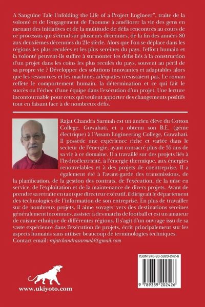 A Sanguine Tale Unfolding the Life of a Project Engineer", traite de la volonté et de l'engagement de l'homme à améliorer la vie des gens en menant des initiatives et de la multitude de défis rencontrés au cours de ce processus qui s'étend sur plusieurs décennies, de la fin des années 80 aux deuxièmes décennies du 21e siècle. Alors que l'on se déplace dans les régions les plus reculées et les plus sereines du pays, l'effort humain et la volonté peuvent-ils suffire à surmonter les défis liés à la construction d'un projet dans les coins les plus reculés du pays, souvent au péril de sa propre vie ? Développer des solutions innovantes et adaptables alors que les ressources et les machines adéquates n'existaient pas. Le roman reflète le comportement humain, la détermination et ce qui fait le succès ou l'échec d'une équipe dans l'exécution d'un projet. Une lecture incontournable pour ceux qui veulent apporter des changements positifs tout en faisant face à de nombreux défis.