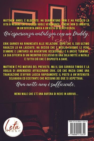 Matthew Angel è bloccato. Ha quarantuno anni e ha passato la vita a negare chi è e cosa vuole veramente, finché non si imbatte in un'offerta unica a un'asta di beneficenza. Un'esperienza natalizia con un Daddy. Erik Garner ha rinunciato alle relazioni. Dopo che il suo ultimo ragazzo lo ha lasciato, ha deciso che è meglio evitare le pene d'amore e limitarsi ad avventure occasionali e a breve termine. La sua offerta di un incontro esclusivo di una sola notte a Natale è tutto ciò che è disposto a dare. Matthew è più maturo del previsto, ma il suo sorriso timido e la voglia di arrendersi affascinano Erik. Ciò che inizia come una transazione d'affari lascia rapidamente il posto a un'intensità selvaggia ed eccitante che nessuno dei due si aspettava. Una notte non è sufficiente. Meno male che c'è una bufera di neve in arrivo...