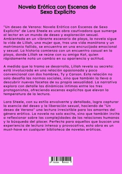 "Un deseo de Verano: Novela Erótica con Escenas de Sexo Explícito" de Lara Steele es una obra cautivadora que sumerge al lector en un mundo de deseo y exploración sexual. Ambientada en un vibrante escenario de playa, la novela sigue la vida de Lillah, una mujer que, tras una vida monótona y un matrimonio fallido, se encuentra en una encrucijada emocional y sexual. La historia comienza con un encuentro casual en la playa, donde Lillah se reúne con su amiga Kat, quien rápidamente nota un cambio en su apariencia y actitud.A medida que la trama se desarrolla, Lillah revela su secreto: está involucrada en una relación apasionada y poco convencional con dos hombres, Ty y Carson. Esta relación no solo desafía las normas sociales, sino que también la lleva a descubrir nuevas facetas de su propia sexualidad. La narrativa explora con detalle las dinámicas íntimas entre los tres protagonistas, ofreciendo escenas explícitas que elevan la temperatura de la lectura.Lara Steele, con su estilo envolvente y detallado, logra capturar la esencia del deseo y la liberación sexual, haciendo de "Un deseo de Verano" una lectura irresistible para los amantes del género erótico. La novela no solo excita, sino que también invita a reflexionar sobre las complejidades de las relaciones humanas y la búsqueda del placer. Perfecta para aquellos que buscan una experiencia de lectura intensa y provocativa, esta obra es un must-have en cualquier biblioteca de novelas eróticas.