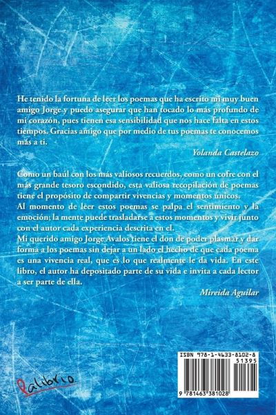 He tenido la fortuna de leer los poemas que ha escrito mi muy buen amigo Jorge y puedo asegurar que han tocado lo más profundo de mi corazón, pues tienen esa sensibilidad que nos hace falta en estos tiempos. Gracias amigo que por medio de tus poemas te conocemos más a ti. Yolanda Castelazo Como un baúl con los más valiosos recuerdos, como un cofre con el más grande tesoro escondido, esta valiosa recopilación de poemas tiene el propósito de compartir vivencias y momentos únicos. Al momento de leer estos poemas se palpa el sentimiento y la emoción; la mente puede trasladarse a estos momentos y vivir junto con el autor cada experiencia descrita en el. Mi querido amigo Jorge Avalos tiene el don de poder plasmar y dar forma a los poemas sin dejar a un lado el hecho de que cada poema es una vivencia real, que es lo que realmente le da vida. En este libro, el autor ha depositado parte de su vida e invita a cada lector a ser parte de ella. Mireida Aguilar