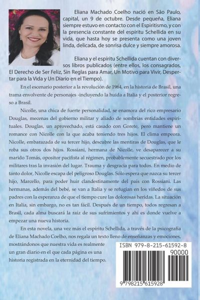 En el escenario posterior a la revolución de 1964, en la historia de Brasil, una trama envolvente de personajes -incluyendo la huida a Italia y el posterior regreso a Brasil. Nicolle, una chica de fuerte personalidad, se enamora del rico empresario Douglas, mecenas del gobierno militar y aliado de sombrías entidades espirituales. Douglas, un aprovechado, está casado con Gorete, pero mantiene un romance con Nicolle con la que acaba teniendo tres hijos. El clima empeora. Nicolle, embarazada de su tercer hijo, descubre las mentiras de Douglas, que le roba sus otros dos hijos. Rossiani, hermana de Nicolle, ve desaparecer a su marido Tomás, opositor pacifista al régimen, probablemente secuestrado por los militares tras la invasión del lugar. Trauma y desgracia para todos. En medio de tanto dolor, Nicolle escapa del peligroso Douglas. Sólo espera que nazca su tercer hijo, Marcello, para poder huir clandestinamente del país con Rossiani. Las hermanas, además del bebé, se van a Italia y se refugian en los viñedos de sus padres con la esperanza de que el tiempo cure las dolorosas heridas. La situación en Italia, sin embargo, no es tan fácil. Después de un tiempo, todos regresan a Brasil, cada alma buscará la raíz de sus sufrimientos y ahí es donde vuelve a empezar una nueva historia. En esta novela, una vez más el espíritu Schellida, a través de la psicografía de Eliana Machado Coelho, nos regala un texto lleno de enseñanzas y emociones, mostrándonos que nuestra vida es realmente un gran diario en el que cada página es una historia registrada en la eternidad del tiempo.
