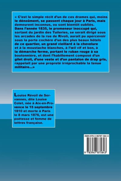 C'est le simple récit d'un de ces drames qui, moins le dénoûment, se passent chaque jour à Paris, mais demeurent inconnus, ou sont bientôt oubliés. Dans l'année 1835, le promeneur inoccupé qui, sortant du jardin des Tuileries, se serait dirigé sous les arcades de la rue de Rivoli, aurait pu apercevoir sous la porte cochère d'un des plus beaux hôtels de ce quartier, un grand vieillard à la chevelure et à la moustache blanches, à l'¿il vif et bon, à la démarche ferme, portant le ruban rouge à sa boutonnière, et dont l'habillement composé d'un gilet droit, d'une veste et d'un pantalon de drap gris, rappelait par une propreté irréprochable la tenue militaire...