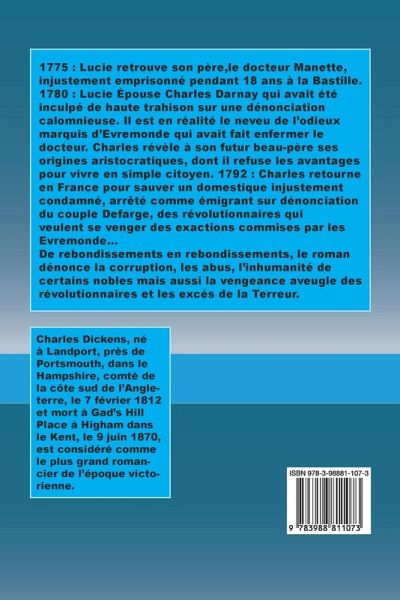 1775 : Lucie retrouve son père,le docteur Manette, injustement emprisonné pendant 18 ans à la Bastille. 1780 : Lucie Èpouse Charles Darnay qui avait été inculpé de haute trahison sur une dénonciation calomnieuse. Il est en réalité le neveu de l'odieux marquis d'Evremonde qui avait fait enfermer le docteur. Charles révèle à son futur beau-père ses origines aristocratiques, dont il refuse les avantages pour vivre en simple citoyen. 1792 : Charles retourne en France pour sauver un domestique injustement condamné, arrêté comme émigrant sur dénonciation du couple Defarge, des révolutionnaires qui veulent se venger des exactions commises par les Evremonde... De rebondissements en rebondissements, le roman dénonce la corruption, les abus, l'inhumanité de certains nobles mais aussi la vengeance aveugle des révolutionnaires et les excés de la Terreur.