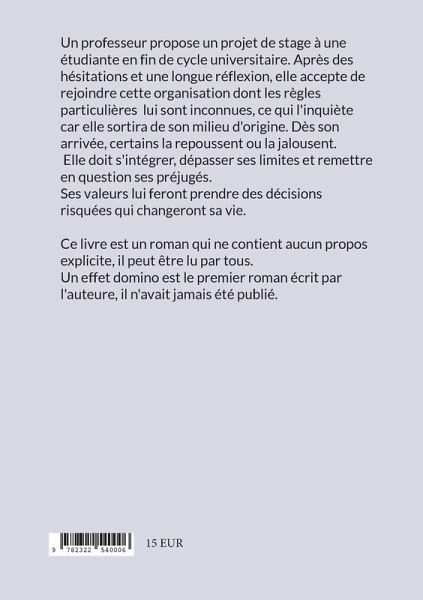 Un professeur propose un projet de stage à une étudiante en fin de cycle universitaire. Après des hésitations et une longue réflexion, elle accepte de rejoindre cette organisation dont les règles particulières lui sont inconnues, ce qui l'inquiète car elle sortira de son milieu d'origine. Dès son arrivée, certains la repoussent ou la jalousent. Elle doit s'intégrer, dépasser ses limites et remettre en question ses préjugés. Ses valeurs lui feront prendre des décisions risquées qui changeront sa vie. Ce livre est un roman qui ne contient aucun propos explicite, il peut être lu par tous. Un effet domino est le premier roman écrit par l'auteure, il n'avait jamais été publié.