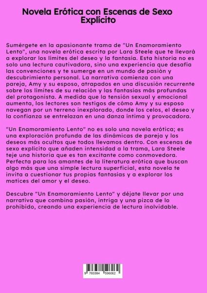 Sumérgete en la apasionante trama de "Un Enamoramiento Lento", una novela erótica escrita por Lara Steele que te llevará a explorar los límites del deseo y la fantasía. Esta historia no es solo una lectura cautivadora, sino una experiencia que desafía las convenciones y te sumerge en un mundo de pasión y descubrimiento personal. La narrativa comienza con una pareja, Amy y su esposo, atrapados en una discusión recurrente sobre los límites de su relación y las fantasías más profundas del protagonista. A medida que la tensión sexual y emocional aumenta, los lectores son testigos de cómo Amy y su esposo navegan por un terreno inexplorado, donde los celos, el deseo y la confianza se entrelazan en una danza íntima y provocadora."Un Enamoramiento Lento" no es solo una novela erótica; es una exploración profunda de las dinámicas de pareja y los deseos más ocultos que todos llevamos dentro. Con escenas de sexo explícito que añaden intensidad a la trama, Lara Steele teje una historia que es tan excitante como conmovedora. Perfecta para los amantes de la literatura erótica que buscan algo más que una simple lectura superficial, esta novela te invita a cuestionar tus propias fantasías y a explorar los matices del amor y el deseo.Descubre "Un Enamoramiento Lento" y déjate llevar por una narrativa que combina pasión, intriga y una pizca de lo prohibido, creando una experiencia de lectura inolvidable.