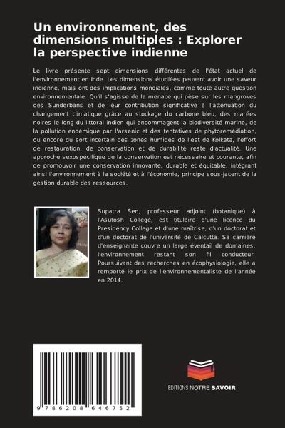 Le livre présente sept dimensions différentes de l'état actuel de l'environnement en Inde. Les dimensions étudiées peuvent avoir une saveur indienne, mais ont des implications mondiales, comme toute autre question environnementale. Qu'il s'agisse de la menace qui pèse sur les mangroves des Sunderbans et de leur contribution significative à l'atténuation du changement climatique grâce au stockage du carbone bleu, des marées noires le long du littoral indien qui endommagent la biodiversité marine, de la pollution endémique par l'arsenic et des tentatives de phytoremédiation, ou encore du sort incertain des zones humides de l'est de Kolkata, l'effort de restauration, de conservation et de durabilité reste d'actualité. Une approche sexospécifique de la conservation est nécessaire et courante, afin de promouvoir une conservation innovante, durable et équitable, intégrant ainsi l'environnement à la société et à l'économie, principe sous-jacent de la gestion durable des ressources.