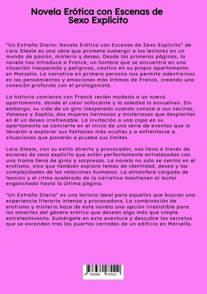 "Un Extraño Diario: Novela Erótica con Escenas de Sexo Explícito" de Lara Steele es una obra que promete sumergir a los lectores en un mundo de pasión, misterio y deseo. Desde las primeras páginas, la novela nos introduce a Franck, un hombre que se encuentra en una situación inesperada y peligrosa, cautivo en su propio apartamento en Marsella. La narrativa en primera persona nos permite adentrarnos en los pensamientos y emociones más íntimos de Franck, creando una conexión profunda con el protagonista.La historia comienza con Franck recién mudado a un nuevo apartamento, donde el calor sofocante y la soledad lo envuelven. Sin embargo, su vida da un giro inesperado cuando conoce a sus vecinas, Vanessa y Sophia, dos mujeres hermosas y misteriosas que despiertan en él un deseo irrefrenable. La invitación a una copa en su apartamento se convierte en el inicio de una serie de eventos que lo llevarán a explorar sus fantasías más ocultas y a enfrentarse a situaciones que pondrán a pruebasus límites.Lara Steele, con su estilo directo y provocador, nos lleva a través de escenas de sexo explícito que están perfectamente entrelazadas con una trama llena de giros y sorpresas. La novela no solo se centra en el erotismo, sino que también explora temas de identidad, deseo y las complejidades de las relaciones humanas. La atmósfera cargada de tensión y el ritmo acelerado de la narrativa mantienen al lector enganchado hasta la última página."Un Extraño Diario" es una lectura ideal para aquellos que buscan una experiencia literaria intensa y provocadora. La combinación de erotismo y misterio hace de esta novela una opción irresistible para los amantes del género erótico que desean algo más que simple entretenimiento. Sumérgete en esta aventura y descubre los secretos que se esconden tras las puertas cerradas de un edificio en Marsella.