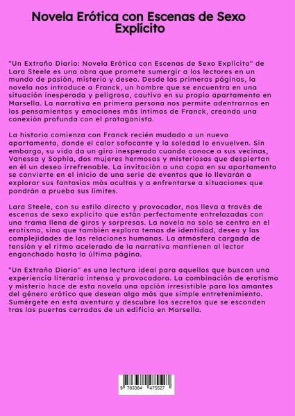 "Un Extraño Diario: Novela Erótica con Escenas de Sexo Explícito" de Lara Steele es una obra que promete sumergir a los lectores en un mundo de pasión, misterio y deseo. Desde las primeras páginas, la novela nos introduce a Franck, un hombre que se encuentra en una situación inesperada y peligrosa, cautivo en su propio apartamento en Marsella. La narrativa en primera persona nos permite adentrarnos en los pensamientos y emociones más íntimos de Franck, creando una conexión profunda con el protagonista.La historia comienza con Franck recién mudado a un nuevo apartamento, donde el calor sofocante y la soledad lo envuelven. Sin embargo, su vida da un giro inesperado cuando conoce a sus vecinas, Vanessa y Sophia, dos mujeres hermosas y misteriosas que despiertan en él un deseo irrefrenable. La invitación a una copa en su apartamento se convierte en el inicio de una serie de eventos que lo llevarán a explorar sus fantasías más ocultas y a enfrentarse a situaciones que pondrán a pruebasus límites.Lara Steele, con su estilo directo y provocador, nos lleva a través de escenas de sexo explícito que están perfectamente entrelazadas con una trama llena de giros y sorpresas. La novela no solo se centra en el erotismo, sino que también explora temas de identidad, deseo y las complejidades de las relaciones humanas. La atmósfera cargada de tensión y el ritmo acelerado de la narrativa mantienen al lector enganchado hasta la última página."Un Extraño Diario" es una lectura ideal para aquellos que buscan una experiencia literaria intensa y provocadora. La combinación de erotismo y misterio hace de esta novela una opción irresistible para los amantes del género erótico que desean algo más que simple entretenimiento. Sumérgete en esta aventura y descubre los secretos que se esconden tras las puertas cerradas de un edificio en Marsella.