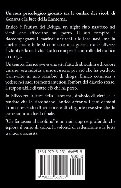 Un noir psicologico giocato tra le ombre dei vicoli di Genova e la luce della Lanterna. Enrico è l'autista del Beluga, un night club nascosto nei vicoli che affacciano sul porto. Il suo compito è riaccompagnare i marinai ubriachi alle loro navi, ma in quelle strade buie si combatte una guerra tra le diverse fazioni della malavita che lottano per il controllo del traffico di droga. Un tempo, Enrico aveva una vita fatta di abitudini e di calore umano, ora ridotta a un'ossessione per ciò che ha perduto. Coinvolto in uno scambio di droga, Enrico comincia a vedere nei suoi tormenti interiori l'ombra del diavolo stesso, il responsabile di tutto ciò che ha perso. In bilico tra la luce della Lanterna, simbolo di virtù, e le tenebre che lo circondano, Enrico affronta i suoi demoni in un crescendo di tensione e di allegorie ossessive che lo porteranno al duello finale. "Un fantasma al citofono" è un noir cupo e profondo che esplora il senso di colpa, la volontà di redenzione e la lotta tra luce e oscurità.