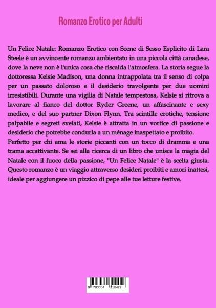 Un Felice Natale: Romanzo Erotico con Scene di Sesso Esplicito di Lara Steele è un avvincente romanzo ambientato in una piccola città canadese, dove la neve non è l'unica cosa che riscalda l'atmosfera. La storia segue la dottoressa Kelsie Madison, una donna intrappolata tra il senso di colpa per un passato doloroso e il desiderio travolgente per due uomini irresistibili. Durante una vigilia di Natale tempestosa, Kelsie si ritrova a lavorare al fianco del dottor Ryder Greene, un affascinante e sexy medico, e del suo partner Dixon Flynn. Tra scintille erotiche, tensione palpabile e segreti svelati, Kelsie è attratta in un vortice di passione e desiderio che potrebbe condurla a un ménage inaspettato e proibito.Perfetto per chi ama le storie piccanti con un tocco di dramma e una trama accattivante. Se sei alla ricerca di un libro che unisce la magia del Natale con il fuoco della passione, "Un Felice Natale" è la scelta giusta. Questo romanzo è un viaggio attraverso desideri proibiti e amori inattesi, ideale per aggiungere un pizzico di pepe alle tue letture festive.