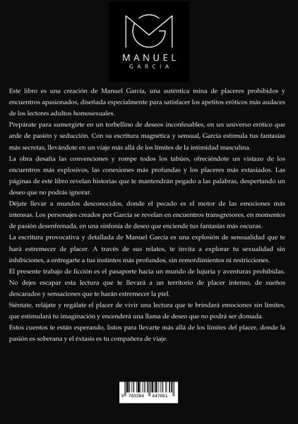 Este libro es una creación de Manuel García, una auténtica mina de placeres prohibidos y encuentros apasionados, diseñada especialmente para satisfacer los apetitos eróticos más audaces de los lectores adultos homosexuales.Prepárate para sumergirte en un torbellino de deseos inconfesables, en un universo erótico que arde de pasión y seducción. Con su escritura magnética y sensual, García estimula tus fantasías más secretas, llevándote en un viaje más allá de los límites de la intimidad masculina.La obra desafía las convenciones y rompe todos los tabúes, ofreciéndote un vistazo de los encuentros más explosivos, las conexiones más profundas y los placeres más extasiados. Las páginas de este libro revelan historias que te mantendrán pegado a las palabras, despertando un deseo que no podrás ignorar.Déjate llevar a mundos desconocidos, donde el pecado es el motor de las emociones más intensas. Los personajes creados por García se revelan en encuentros transgresores, en momentos de pasión desenfrenada, en una sinfonía de deseo que enciende tus fantasías más oscuras.La escritura provocativa y detallada de Manuel García es una explosión de sensualidad que te hará estremecer de placer. A través de sus relatos, te invita a explorar tu sexualidad sin inhibiciones, a entregarte a tus instintos más profundos, sin remordimientos ni restricciones.El presente trabajo de ficción es el pasaporte hacia un mundo de lujuria y aventuras prohibidas. No dejes escapar esta lectura que te llevará a un territorio de placer intenso, de sueños descarados y sensaciones que te harán estremecer la piel.Siéntate, relájate y regálate el placer de vivir una lectura que te brindará emociones sin límites, que estimulará tu imaginación y encenderá una llama de deseo que no podrá ser domada.Estos cuentos te están esperando, listos para llevarte más allá de los límites del placer, donde la pasión es soberana y el éxtasis es tu compañera de viaje.
