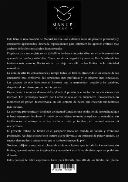 Este libro es una creación de Manuel García, una auténtica mina de placeres prohibidos y encuentros apasionados, diseñada especialmente para satisfacer los apetitos eróticos más audaces de los lectores adultos homosexuales.Prepárate para sumergirte en un torbellino de deseos inconfesables, en un universo erótico que arde de pasión y seducción. Con su escritura magnética y sensual, García estimula tus fantasías más secretas, llevándote en un viaje más allá de los límites de la intimidad masculina.La obra desafía las convenciones y rompe todos los tabúes, ofreciéndote un vistazo de los encuentros más explosivos, las conexiones más profundas y los placeres más extasiados. Las páginas de este libro revelan historias que te mantendrán pegado a las palabras, despertando un deseo que no podrás ignorar.Déjate llevar a mundos desconocidos, donde el pecado es el motor de las emociones más intensas. Los personajes creados por García se revelan en encuentros transgresores, en momentos de pasión desenfrenada, en una sinfonía de deseo que enciende tus fantasías más oscuras.La escritura provocativa y detallada de Manuel García es una explosión de sensualidad que te hará estremecer de placer. A través de sus relatos, te invita a explorar tu sexualidad sin inhibiciones, a entregarte a tus instintos más profundos, sin remordimientos ni restricciones.El presente trabajo de ficción es el pasaporte hacia un mundo de lujuria y aventuras prohibidas. No dejes escapar esta lectura que te llevará a un territorio de placer intenso, de sueños descarados y sensaciones que te harán estremecer la piel.Siéntate, relájate y regálate el placer de vivir una lectura que te brindará emociones sin límites, que estimulará tu imaginación y encenderá una llama de deseo que no podrá ser domada.Estos cuentos te están esperando, listos para llevarte más allá de los límites del placer, donde la pasión es soberana y el éxtasis es tu compañera de viaje.