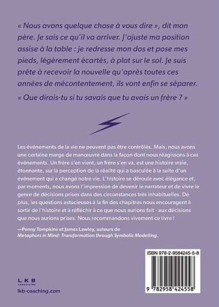 Nous avons quelque chose à vous dire , dit mon père. Je sais ce qu'il va arriver. J'ajuste ma position assise à la table : je redresse mon dos et pose mes pieds, légèrement écartés, à plat sur le sol. Je suis prête à recevoir la nouvelle qu'après toutes ces années de mécontentement, ils vont enfin se séparer. Que dirais-tu si tu savais que tu avais un frère ?