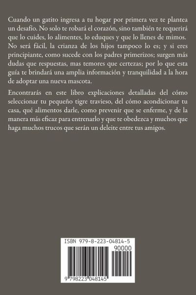 Cuando un gatito ingresa a tu hogar por primera vez te plantea un desafío. No solo te robará el corazón, sino también te requerirá que lo cuides, lo alimentes, lo eduques y que lo llenes de mimos. No será fácil, la crianza de los hijos tampoco lo es; y si eres principiante, como sucede con los padres primerizos; surgen más dudas que respuestas, mas temores que certezas; por lo que esta guía te brindará una amplia información y tranquilidad a la hora de adoptar una nueva mascota. Encontrarás en este libro explicaciones detalladas del cómo seleccionar tu pequeño tigre travieso, del cómo acondicionar tu casa, qué alimentos darle, como prevenir que se enferme, y de la manera más eficaz para entrenarlo y que te obedezca y muchos que haga muchos trucos que serán un deleite entre tus amigos.
