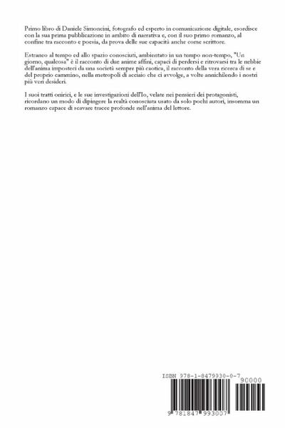 Primo libro di Daniele Simoncini, fotografo ed esperto in comunicazione digitale, esordisce con la sua prima pubblicazione in ambito di narrativa e, con il suo primo romanzo, al confine tra racconto e poesia, da prova delle sue capacità anche come scrittore. Estraneo al tempo ed allo spazio conosciuti, ambientato in un tempo nontempo, "Un giorno, qualcosa" è il racconto di due anime affini, capaci di perdersi e ritrovarsi tra le nebbie dell'anima imposteci da una società sempre più caotica, il racconto della vera ricerca di se e del proprio cammino, nella metropoli di acciaio che ci avvolge, a volte annichilendo i nostri più veri desideri. I suoi tratti onirici, e le sue investigazioni dell'Io, velate nei pensieri dei protagonisti, ricordano un modo di dipingere la realtà conosciuta usato da solo pochi autori. Un piccolo romanzo capace di scavare tracce profonde nell'anima del lettore.