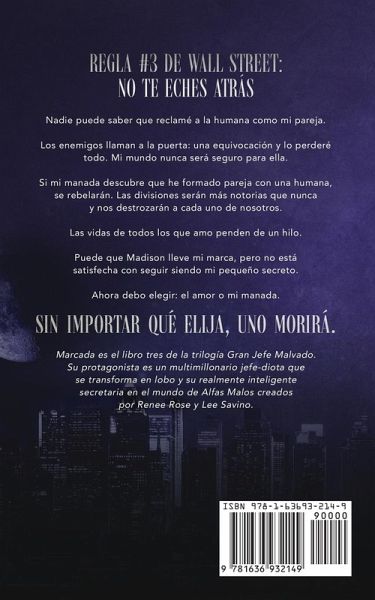 REGLA #3 DE WALL STREET: NO TE ECHES ATRÁS Nadie puede saber que reclamé a la humana como mi pareja Los enemigos llaman a la puerta: una equivocación y lo perderé todo. Mi mundo nunca será seguro para ella. Si mi manada descubre que he formado pareja con una humana, se rebelarán. Las divisiones serán más notorias que nunca y nos destrozarán a cada uno de nosotros. Las vidas de todos los que amo penden de un hilo. Puede que Madison lleve mi marca, pero no está satisfecha con seguir siendo mi pequeño secreto. Ahora debo elegir: el amor o mi manada. Sin importar qué elija, uno morirá. Marcada es el libro tres de la trilogía Gran Jefe Malvado. Su protagonista es un multimillonario jefe-diota que se transforma en lobo y su realmente inteligente secretaria en el mundo de Alfas Malos creados por Renee Rose y Lee Savino.