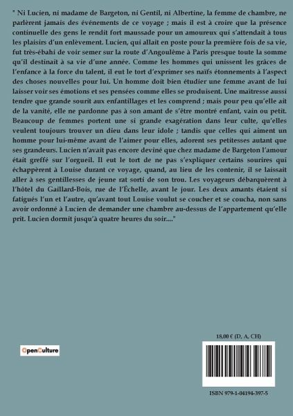 " Ni Lucien, ni madame de Bargeton, ni Gentil, ni Albertine, la femme de chambre, ne parlèrent jamais des événements de ce voyage ; mais il est à croire que la présence continuelle des gens le rendit fort maussade pour un amoureux qui s¿attendait à tous les plaisirs d¿un enlèvement. Lucien, qui allait en poste pour la première fois de sa vie, fut très-ébahi de voir semer sur la route d¿Angoulême à Paris presque toute la somme qüil destinait à sa vie d¿une année. Comme les hommes qui unissent les grâces de l¿enfance à la force du talent, il eut le tort d¿exprimer ses naïfs étonnements à l¿aspect des choses nouvelles pour lui. Un homme doit bien étudier une femme avant de lui laisser voir ses émotions et ses pensées comme elles se produisent. Une maîtresse aussi tendre que grande sourit aux enfantillages et les comprend ; mais pour peu qüelle ait de la vanité, elle ne pardonne pas à son amant de s¿être montré enfant, vain ou petit. Beaucoup de femmes portent une si grande exagération dans leur culte, qüelles veulent toujours trouver un dieu dans leur idole ; tandis que celles qui aiment un homme pour lui-même avant de l¿aimer pour elles, adorent ses petitesses autant que ses grandeurs. Lucien n¿avait pas encore deviné que chez madame de Bargeton l¿amour était greffé sur l¿orgueil. Il eut le tort de ne pas s¿expliquer certains sourires qui échappèrent à Louise durant ce voyage, quand, au lieu de les contenir, il se laissait aller à ses gentillesses de jeune rat sorti de son trou. Les voyageurs débarquèrent à l¿hôtel du Gaillard-Bois, rue de l¿Échelle, avant le jour. Les deux amants étaient si fatigués l¿un et l¿autre, qüavant tout Louise voulut se coucher et se coucha, non sans avoir ordonné à Lucien de demander une chambre au-dessus de l¿appartement qüelle prit. Lucien dormit jusqüà quatre heures du soir...."
