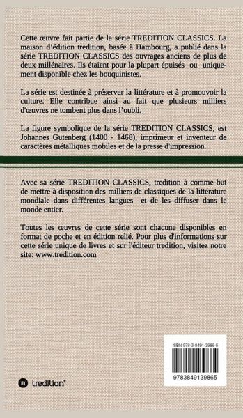 Cette uvre (édition relié) fait partie de la série TREDITION CLASSICS. La maison d édition tredition, basée à Hambourg, a publié dans la série TREDITION CLASSICS des ouvrages anciens de plus de deux millénaires. Ils étaient pour la plupart épuisés ou uniquement disponible chez les bouquinistes. La série est destinée à préserver la littérature et à promouvoir la culture. Avec sa série TREDITION CLASSICS, tredition à comme but de mettre à disposition des milliers de classiques de la littérature mondiale dans différentes langues et de les diffuser dans le monde entier.