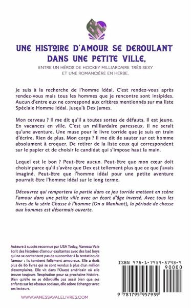 Un livre de Vanessa Vale, auteure à succès ayant figuré dans le palmarès de USA Today, elle nous présente une histoire d'amour se déroulant dans une petite ville, entre un héros de hockey milliardaire très sexy et une romancière en herbe. Je suis à la recherche de l'homme idéal. C'est rendez-vous après rendez-vous mais tous les hommes que je rencontre sont insipides. Aucun d'entre eux ne correspond aux critères mentionnés sur ma liste Spéciale Homme Idéal. Jusqu'à Dex James. Mon cerveau ? Il me dit qu'il a toutes sortes de défauts. Il est jeune. En vacances en ville. C'est un milliardaire paresseux. Il ne serait qu'une aventure. Une muse pour le livre torride que je suis en train d'écrire. Rien de plus. Mon corps ? Il me dit de sauter sur cet homme absolument à croquer. De retirer de la liste ceux qui correspondent sur le papier et de choisir le candidat qui s'impose haut la main. Lequel est le bon ? Peut-être aucun. Peut-être que mon c¿ur doit choisir parce qu'il s'avère que Dex est tellement plus que ce que j'avais imaginé. Peut-être que l'homme idéal pour une petite aventure pourrait être l'homme idéal sur le long terme. Découvrez qui remportera la partie dans ce jeu torride mettant en scène l'amour dans une petite ville avec un écart d'âge inversé. Avec tous les livres de la série Chasse à l'homme (On a Manhunt), la période de chasse aux hommes est désormais ouverte.