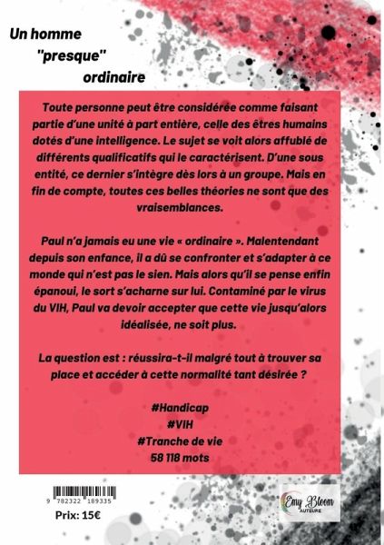 Toute personne peut être considérée comme faisant partie d''une unité à part entière, celle des êtres humains, dotés d'une intelligence. Le sujet se voit alors affublé de différents qualificatifs qui le caractérisent. D'une sous entité, ce dernier s'intègre dès lors à un groupe. Mais en fin de compte, toutes ces belles théories ne sont que des vraisemblances.Paul n'a jamais eu une vie "ordinaire". Malentendant depuis son enfance, il a dû se confronter et s'adapter à ce monde qui n'est pas le sien. Mais alors qu'il se pense enfin épanoui, le sort s'acharne sur lui. Contaminé par le virus du VIH, Paul va devoir accepter cette nouvelle vie jusqu'alors idéalisée, ne soit plus.La question est: réussira-t-il malgré tout à trouver sa place et accéder à cette normalité tant désirée?#handicap#VIH#Trance de vie58 118 mots