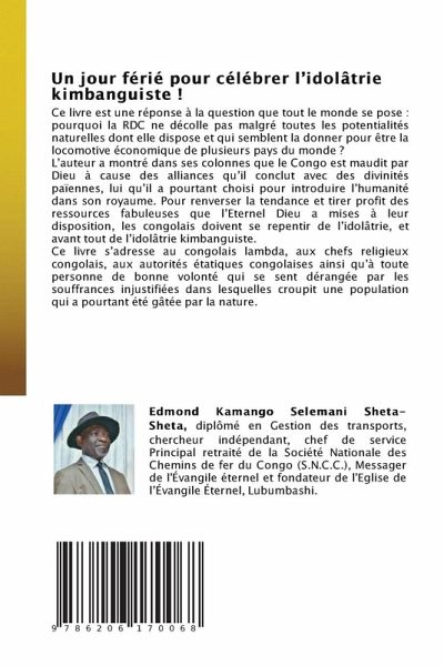 Ce livre est une réponse à la question que tout le monde se pose : pourquoi la RDC ne décolle pas malgré toutes les potentialités naturelles dont elle dispose et qui semblent la donner pour être la locomotive économique de plusieurs pays du monde ? L'auteur a montré dans ses colonnes que le Congo est maudit par Dieu à cause des alliances qu'il conclut avec des divinités païennes, lui qu'il a pourtant choisi pour introduire l'humanité dans son royaume. Pour renverser la tendance et tirer profit des ressources fabuleuses que l'Eternel Dieu a mises à leur disposition, les congolais doivent se repentir de l'idolâtrie, et avant tout de l'idolâtrie kimbanguiste.Ce livre s'adresse au congolais lambda, aux chefs religieux congolais, aux autorités étatiques congolaises ainsi qu'à toute personne de bonne volonté qui se sent dérangée par les souffrances injustifiées dans lesquelles croupit une population qui a pourtant été gâtée par la nature.