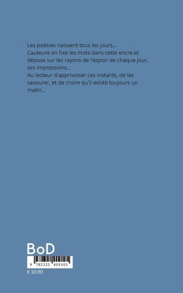 Les poésies naissent tous les jours... L'auteure en fixe les mots dans cette encre et dépose sur les rayons de l'espoir naissant chaque jour, ses impressions... Au lecteur d'apprivoiser ces instants, de les savourer, et de croire qu'il existe toujours un matin...
