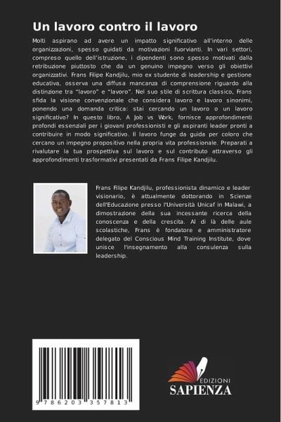 Molti aspirano ad avere un impatto significativo all'interno delle organizzazioni, spesso guidati da motivazioni fuorvianti. In vari settori, compreso quello dell'istruzione, i dipendenti sono spesso motivati ¿¿dalla retribuzione piuttosto che da un genuino impegno verso gli obiettivi organizzativi. Frans Filipe Kandjilu, mio ¿¿ex studente di leadership e gestione educativa, osserva una diffusa mancanza di comprensione riguardo alla distinzione tra "lavoro" e "lavoro". Nel suo stile di scrittura classico, Frans sfida la visione convenzionale che considera lavoro e lavoro sinonimi, ponendo una domanda critica: stai cercando un lavoro o un lavoro significativo? In questo libro, A Job vs Work, fornisce approfondimenti profondi essenziali per i giovani professionisti e gli aspiranti leader pronti a contribuire in modo significativo. Il lavoro funge da guida per coloro che cercano un impegno propositivo nella propria vita professionale. Preparati a rivalutare la tua prospettiva sul lavoro e sul contributo attraverso gli approfondimenti trasformativi presentati da Frans Filipe Kandjilu.