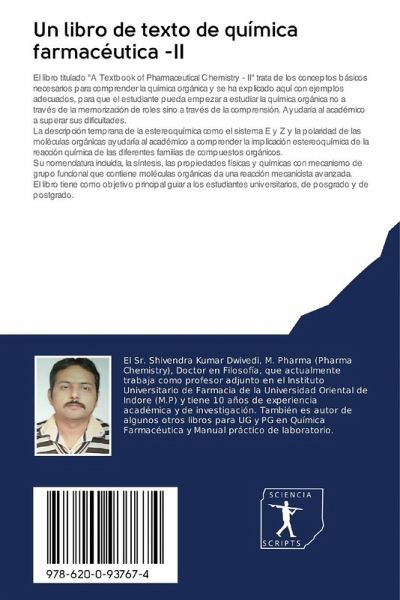 El libro titulado "A Textbook of Pharmaceutical Chemistry - II" trata de los conceptos básicos necesarios para comprender la química orgánica y se ha explicado aquí con ejemplos adecuados, para que el estudiante pueda empezar a estudiar la química orgánica no a través de la memorización de roles sino a través de la comprensión. Ayudaría al académico a superar sus dificultades.La descripción temprana de la estereoquímica como el sistema E y Z y la polaridad de las moléculas orgánicas ayudaría al académico a comprender la implicación estereoquímica de la reacción química de las diferentes familias de compuestos orgánicos.Su nomenclatura incluida, la síntesis, las propiedades físicas y químicas con mecanismo de grupo funcional que contiene moléculas orgánicas da una reacción mecanicista avanzada.El libro tiene como objetivo principal guiar a los estudiantes universitarios, de posgrado y de postgrado.