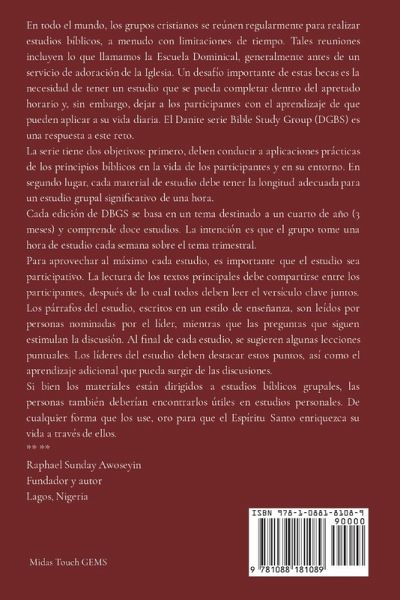 En todo el mundo, los grupos cristianos se reúnen regularmente para realizar estudios bíblicos, a menudo con limitaciones de tiempo. Tales reuniones incluyen lo que llamamos la Escuela Dominical, generalmente antes de un servicio de adoración de la Iglesia. Un desafío importante de estas becas es la necesidad de tener un estudio que se pueda completar dentro del apretado horario y, sin embargo, dejar a los participantes con el aprendizaje de que pueden aplicar a su vida diaria. El Danite serie Bible Study Group (DGBS) es una respuesta a este reto. La serie tiene dos objetivos: primero, deben conducir a aplicaciones prácticas de los principios bíblicos en la vida de los participantes y en su entorno. En segundo lugar, cada material de estudio debe tener la longitud adecuada para un estudio grupal significativo de una hora. Cada edición de DBGS se basa en un tema destinado a un cuarto de año (3 meses) y comprende doce estudios. La intención es que el grupo tome una hora de estudio cada semana sobre el tema trimestral. Para aprovechar al máximo cada estudio, es importante que el estudio sea participativo. La lectura de los textos principales debe compartirse entre los participantes, después de lo cual todos deben leer el versículo clave juntos. Los párrafos del estudio, escritos en un estilo de enseñanza, son leídos por personas nominadas por el líder, mientras que las preguntas que siguen estimulan la discusión. Al final de cada estudio, se sugieren algunas lecciones puntuales. Los líderes del estudio deben destacar estos puntos, así como el aprendizaje adicional que pueda surgir de las discusiones. Si bien los materiales están dirigidos a estudios bíblicos grupales, las personas también deberían encontrarlos útiles en estudios personales. De cualquier forma que los use, oro para que el Espíritu Santo enriquezca su vida a través de ellos. ** ** Raphael Sunday Awoseyin Fundador y autor Lagos, Nigeria