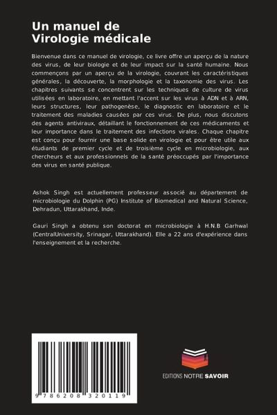Bienvenue dans ce manuel de virologie, ce livre offre un aperçu de la nature des virus, de leur biologie et de leur impact sur la santé humaine. Nous commençons par un aperçu de la virologie, couvrant les caractéristiques générales, la découverte, la morphologie et la taxonomie des virus. Les chapitres suivants se concentrent sur les techniques de culture de virus utilisées en laboratoire, en mettant l'accent sur les virus à ADN et à ARN, leurs structures, leur pathogenèse, le diagnostic en laboratoire et le traitement des maladies causées par ces virus. De plus, nous discutons des agents antiviraux, détaillant le fonctionnement de ces médicaments et leur importance dans le traitement des infections virales. Chaque chapitre est conçu pour fournir une base solide en virologie et pour être utile aux étudiants de premier cycle et de troisième cycle en microbiologie, aux chercheurs et aux professionnels de la santé préoccupés par l'importance des virus en santé publique.
