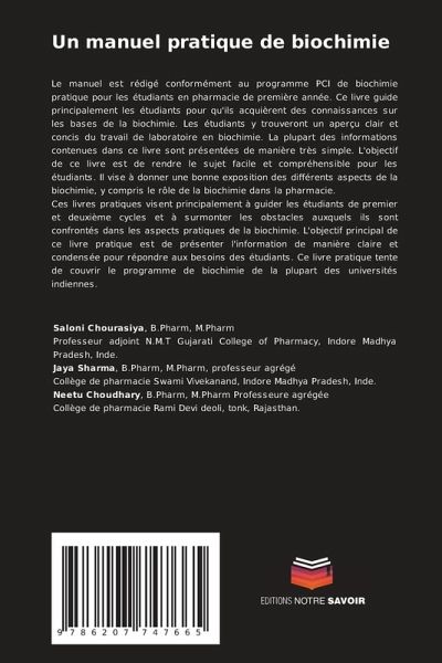Le manuel est rédigé conformément au programme PCI de biochimie pratique pour les étudiants en pharmacie de première année. Ce livre guide principalement les étudiants pour qu'ils acquièrent des connaissances sur les bases de la biochimie. Les étudiants y trouveront un aperçu clair et concis du travail de laboratoire en biochimie. La plupart des informations contenues dans ce livre sont présentées de manière très simple. L'objectif de ce livre est de rendre le sujet facile et compréhensible pour les étudiants. Il vise à donner une bonne exposition des différents aspects de la biochimie, y compris le rôle de la biochimie dans la pharmacie.Ces livres pratiques visent principalement à guider les étudiants de premier et deuxième cycles et à surmonter les obstacles auxquels ils sont confrontés dans les aspects pratiques de la biochimie. L'objectif principal de ce livre pratique est de présenter l'information de manière claire et condensée pour répondre aux besoins des étudiants. Ce livre pratique tente de couvrir le programme de biochimie de la plupart des universités indiennes.