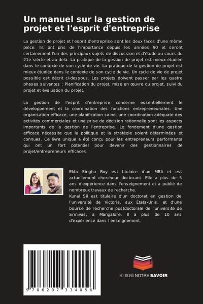 La gestion de projet et l'esprit d'entreprise sont les deux faces d'une même pièce. Ils ont pris de l'importance depuis les années 90 et seront certainement l'un des principaux sujets de discussion et d'étude au cours du 21e siècle et au-delà. La pratique de la gestion de projet est mieux étudiée dans le contexte de son cycle de vie. La pratique de la gestion de projet est mieux étudiée dans le contexte de son cycle de vie. Un cycle de vie de projet possible est décrit ci-dessous. Les projets doivent passer par les quatre phases suivantes : Planification du projet, mise en oeuvre du projet, suivi du projet et évaluation du projet.La gestion de l'esprit d'entreprise concerne essentiellement le développement et la coordination des fonctions entrepreneuriales. Une organisation efficace, une planification saine, une coordination adéquate des activités commerciales et une prise de décision rationnelle sont les aspects importants de la gestion de l'entreprise. Le fondement d'une gestion efficace nécessite que la politique et la stratégie soient déterminées et connues. Ce livre unique a été conçu pour les entrepreneurs performants qui ont un fort potentiel pour devenir des gestionnaires de projet/entrepreneurs efficaces.