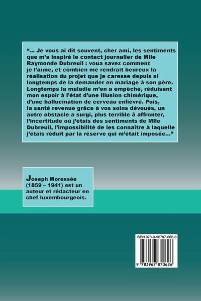 "... Je vous ai dit souvent, cher ami, les sentiments que m’a inspiré le contact journalier de Mlle Raymonde Dubreuil : voua savez comment je l’aime, et combien me rendrait heureux la réalisation du projet que je caresse depuis si longtemps de la demander en mariage à son père. Longtemps la maladie m’en a empêché, réduisant mon espoir à l’état d’une illusion chimérique, d’une hallucination de cerveau enfiévré. Puis, la santé revenue grâce à vos soins dévoués, un autre obstacle a surgi, plus terrible à affronter, l’incertitude où j’étais des sentiments de Mlle Dubreuil, l’impossibilité de les connaître à laquelle j’étais réduit par la réserve qui m’était imposée..."