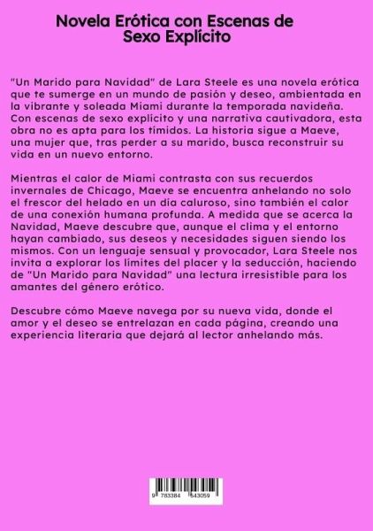"Un Marido para Navidad" de Lara Steele es una novela erótica que te sumerge en un mundo de pasión y deseo, ambientada en la vibrante y soleada Miami durante la temporada navideña. Con escenas de sexo explícito y una narrativa cautivadora, esta obra no es apta para los tímidos. La historia sigue a Maeve, una mujer que, tras perder a su marido, busca reconstruir su vida en un nuevo entorno. Mientras el calor de Miami contrasta con sus recuerdos invernales de Chicago, Maeve se encuentra anhelando no solo el frescor del helado en un día caluroso, sino también el calor de una conexión humana profunda. A medida que se acerca la Navidad, Maeve descubre que, aunque el clima y el entorno hayan cambiado, sus deseos y necesidades siguen siendo los mismos. Con un lenguaje sensual y provocador, Lara Steele nos invita a explorar los límites del placer y la seducción, haciendo de "Un Marido para Navidad" una lectura irresistible para los amantes del género erótico. Descubre cómo Maeve navega por su nueva vida, donde el amor y el deseo se entrelazan en cada página, creando una experiencia literaria que dejará al lector anhelando más.