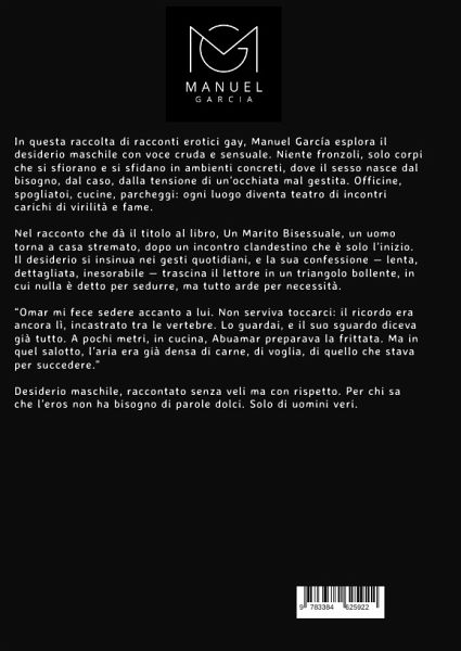 In questa raccolta di racconti erotici gay, Manuel García esplora il desiderio maschile con voce cruda e sensuale. Niente fronzoli, solo corpi che si sfiorano e si sfidano in ambienti concreti, dove il sesso nasce dal bisogno, dal caso, dalla tensione di un'occhiata mal gestita. Officine, spogliatoi, cucine, parcheggi: ogni luogo diventa teatro di incontri carichi di virilità e fame.Nel racconto che dà il titolo al libro, Un Marito Bisessuale, un uomo torna a casa stremato, dopo un incontro clandestino che è solo l'inizio. Il desiderio si insinua nei gesti quotidiani, e la sua confessione - lenta, dettagliata, inesorabile - trascina il lettore in un triangolo bollente, in cui nulla è detto per sedurre, ma tutto arde per necessità."Omar mi fece sedere accanto a lui. Non serviva toccarci: il ricordo era ancora lì, incastrato tra le vertebre. Lo guardai, e il suo sguardo diceva già tutto. A pochi metri, in cucina, Abuamar preparava la frittata. Ma in quel salotto, l'aria era già densa di carne, di voglia, di quello che stava per succedere."Desiderio maschile, raccontato senza veli ma con rispetto. Per chi sa che l'eros non ha bisogno di parole dolci. Solo di uomini veri.