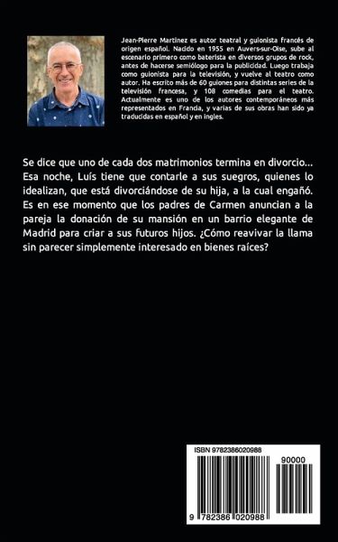 Se dice que uno de cada dos matrimonios termina en divorcio... Esa noche, Luís tiene que contarle a sus suegros, quienes lo idealizan, que está divorciándose de su hija, a la cual engañó. Es en ese momento que los padres de Carmen anuncian a la pareja la donación de su mansión en un barrio elegante de Madrid para criar a sus futuros hijos. ¿Cómo reavivar la llama sin parecer simplemente interesado en bienes raíces? Jean-Pierre Martinez es autor teatral y guionista francés de origen español. Nacido en 1955 en Auvers-sur-Oise, sube al escenario primero como baterista en diversos grupos de rock, antes de hacerse semiólogo para la publicidad. Luego trabaja como guionista para la televisión, y vuelve al teatro como autor. Ha escrito más de 60 guiones para distintas series de la televisión francesa, y 108 comedias para el teatro. Actualmente es uno de los autores contemporáneos más representados en Francia, y varias de sus obras han sido ya traducidas en español y en ingles.