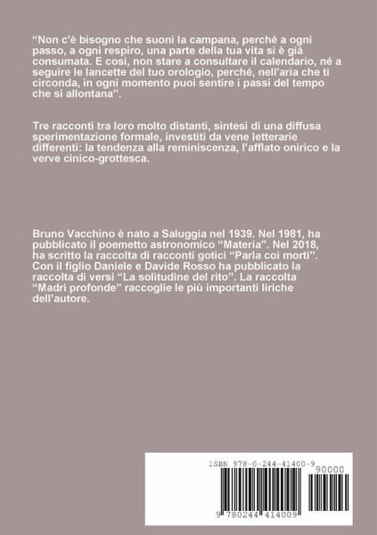 "Non c'è bisogno che suoni la campana, perché a ogni passo, a ogni respiro, una parte della tua vita si è già consumata. E così, non stare a consultare il calendario, né a seguire le lancette del tuo orologio, perché, nell'aria che ti circonda, in ogni momento puoi sentire i passi del tempo che si allontana". Tre racconti tra loro molto distanti, sintesi di una diffusa sperimentazione formale, investiti da vene letterarie differenti: la tendenza alla reminiscenza, l'afflato onirico e la verve cinico-grottesca.