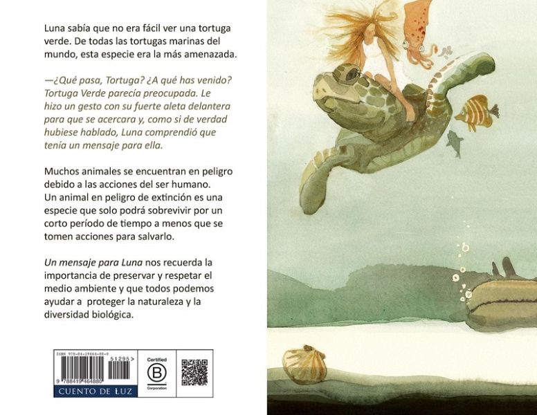 A little inquisitive girl and a great green turtle go on a journey that will remind them of the importance of preserving and respecting the environment. Moon knew it was unusual to see a green turtle. Out of all the sea turtles in the world, they were the species that was most at risk. The turtle beckoned, Come, with its strong front flipper, and, as if it had actually spoken, Moon knew that it wanted to show her something. This is how the two of them submerged themselves in the water and embarked on a journey that would take them to witness the wonders of the world, but also its threats. Many animals are endangered or threatened due to human actions. An endangered animal is a species that will only be able to survive for a short period of time unless action is taken to save it. Una gran tortuga verde y una niña muy curiosa emprenderán un viaje que les recordará la importancia de preservar y respetar el medio ambiente. Luna sabía que no era fácil ver una tortuga verde. De todas las tortugas marinas del mundo, esta especie era la más amenazada. Tortuga Verde parecía preocupada. Le hizo un gesto con su fuerte aleta delantera para que se acercara y, como si de verdad hubiese hablado, Luna comprendió que tenía un mensaje para ella. Así fue como las dos se sumergieron en el agua y emprendieron un viaje que las llevaría a presenciar las maravillas del mundo, pero también las amenazas que este sufre. Muchos animales se encuentran en peligro debido a las acciones del ser humano. Un animal en peligro de extinción es una especie que solo podrá sobrevivir por un corto período de tiempo a menos que se tomen acciones para salvarlo.
