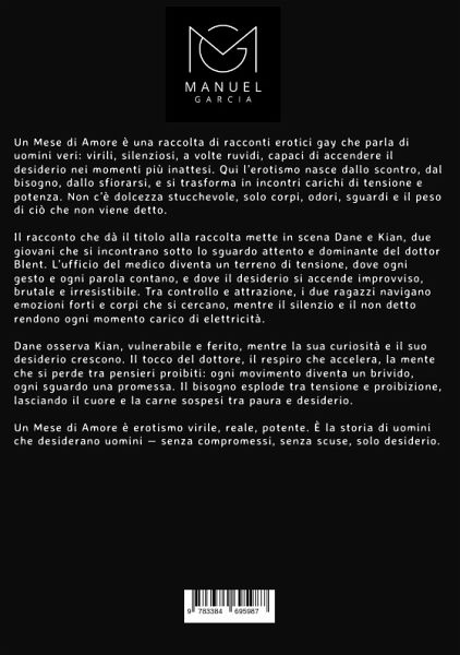 Un Mese di Amore è una raccolta di racconti erotici gay che parla di uomini veri: virili, silenziosi, a volte ruvidi, capaci di accendere il desiderio nei momenti più inattesi. Qui l'erotismo nasce dallo scontro, dal bisogno, dallo sfiorarsi, e si trasforma in incontri carichi di tensione e potenza. Non c'è dolcezza stucchevole, solo corpi, odori, sguardi e il peso di ciò che non viene detto.Il racconto che dà il titolo alla raccolta mette in scena Dane e Kian, due giovani che si incontrano sotto lo sguardo attento e dominante del dottor Blent. L'ufficio del medico diventa un terreno di tensione, dove ogni gesto e ogni parola contano, e dove il desiderio si accende improvviso, brutale e irresistibile. Tra controllo e attrazione, i due ragazzi navigano emozioni forti e corpi che si cercano, mentre il silenzio e il non detto rendono ogni momento carico di elettricità.Dane osserva Kian, vulnerabile e ferito, mentre la sua curiosità e il suo desiderio crescono. Il tocco del dottore, il respiro che accelera, la mente che si perde tra pensieri proibiti: ogni movimento diventa un brivido, ogni sguardo una promessa. Il bisogno esplode tra tensione e proibizione, lasciando il cuore e la carne sospesi tra paura e desiderio.Un Mese di Amore è erotismo virile, reale, potente. È la storia di uomini che desiderano uomini - senza compromessi, senza scuse, solo desiderio.