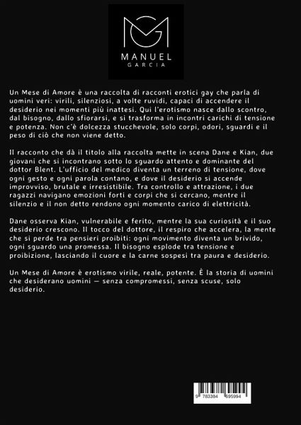 Un Mese di Amore è una raccolta di racconti erotici gay che parla di uomini veri: virili, silenziosi, a volte ruvidi, capaci di accendere il desiderio nei momenti più inattesi. Qui l'erotismo nasce dallo scontro, dal bisogno, dallo sfiorarsi, e si trasforma in incontri carichi di tensione e potenza. Non c'è dolcezza stucchevole, solo corpi, odori, sguardi e il peso di ciò che non viene detto.Il racconto che dà il titolo alla raccolta mette in scena Dane e Kian, due giovani che si incontrano sotto lo sguardo attento e dominante del dottor Blent. L'ufficio del medico diventa un terreno di tensione, dove ogni gesto e ogni parola contano, e dove il desiderio si accende improvviso, brutale e irresistibile. Tra controllo e attrazione, i due ragazzi navigano emozioni forti e corpi che si cercano, mentre il silenzio e il non detto rendono ogni momento carico di elettricità.Dane osserva Kian, vulnerabile e ferito, mentre la sua curiosità e il suo desiderio crescono. Il tocco del dottore, il respiro che accelera, la mente che si perde tra pensieri proibiti: ogni movimento diventa un brivido, ogni sguardo una promessa. Il bisogno esplode tra tensione e proibizione, lasciando il cuore e la carne sospesi tra paura e desiderio.Un Mese di Amore è erotismo virile, reale, potente. È la storia di uomini che desiderano uomini - senza compromessi, senza scuse, solo desiderio.