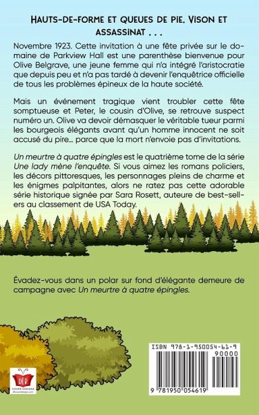 Hauts-de-forme et queues de pie. Vison et assassinat . . . Novembre 1923. Cette invitation à une fête privée sur le domaine de Parkview Hall est une parenthèse bienvenue pour Olive Belgrave, une jeune femme qui n'a intégré l'aristocratie que depuis peu et n'a pas tardé à devenir l'enquêtrice officielle de tous les problèmes épineux de la haute société. Mais un événement tragique vient troubler cette fête somptueuse et Peter, le cousin d'Olive, se retrouve suspect numéro un. Olive va devoir démasquer le véritable tueur parmi les bourgeois élégants avant qu'un homme innocent ne soit accusé du pire... parce que la mort n'envoie pas d'invitations. Un meurtre à quatre épingles est le quatrième tome de la série Une lady mène l'enquête. Si vous aimez les romans policiers, les décors pittoresques, les personnages pleins de charme et les énigmes palpitantes, alors ne ratez pas cette adorable série historique signée par Sara Rosett, auteure de best-sellers au classement de USA Today. Évadez-vous dans un polar sur fond d'élégante demeure de campagne avec Un meurtre à quatre épingles.